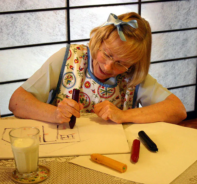 Over the page: an old woman with thin, gold-rimmed spectacles and a blue ribbon in her hair, wearing a child’s smock and sitting at a table, her fist wrapped around an oversized crayon, a glass of milk on a coaster in front of her. The same woman, on a couch this time, her legs tucked underneath her, surrounded by old board games, sticking her tongue out at somebody off-screen. Another man, also bald, but clothed - a woollen sweater, gray shorts, socks and sandals – lying on his stomach next to a fireplace, kicking his feet in the air, reading from a children’s annual, beaming with delight.
