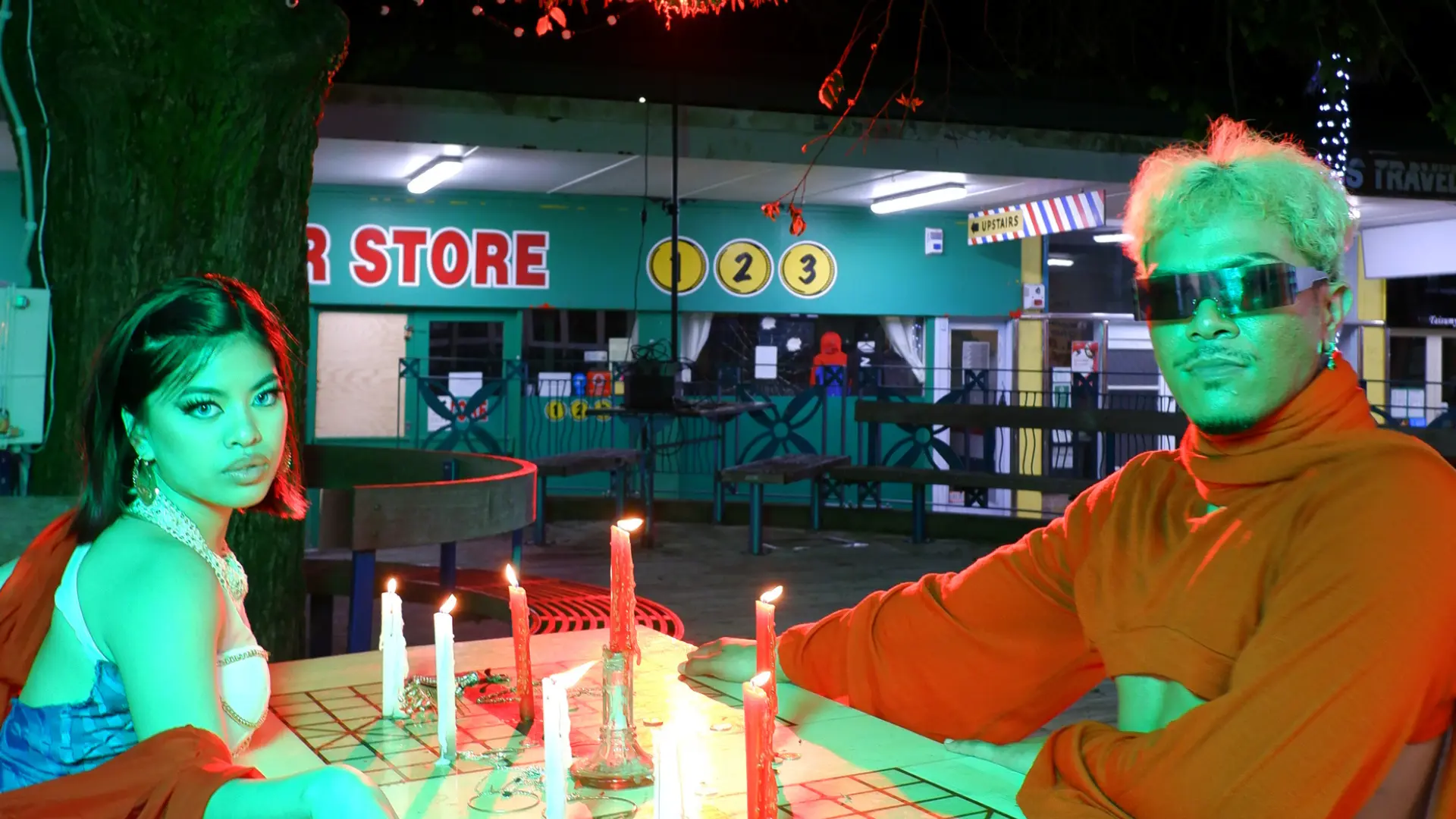 As the scene transitions into colour, and the backing track transitions from melancholy opera to a stirring ballroom beat, the camera pans out. Chuo and Afakasi are framed against Northcote Town Centre. Wearing their costumes from the previous sequence, the supernatural is contrasted against the mundane, suggesting that perhaps they are one and the same. Chuo’s makeup, by Hailee Tamore, sparkles in the full light of day. Magic and mystery surround us, and are imbued in the realities of lived experience.