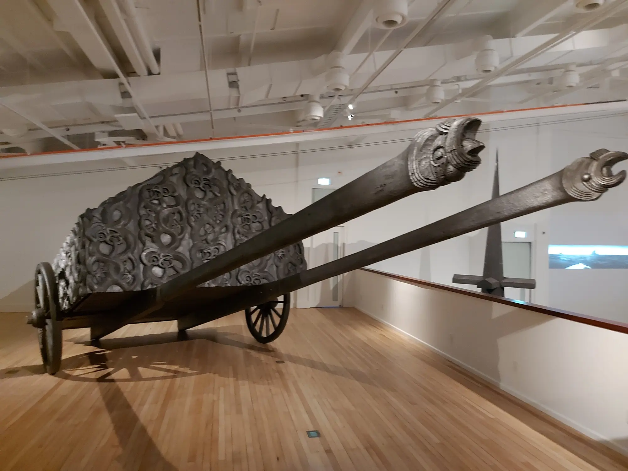 The standout work in the exhibition is undoubtedly Maungārongo ki te Whenua, Maungārongo ki te Tangata, a mobile pātaka of sorts that resembles a wooden horse-drawn carriage, or possibly a double-barrelled military tank (Graham has been known to carve military vehicles in the past). Carved wooden panels with distinctive Taranaki tuare (blind eel) serpentine figures encase the entire surface of the structure. Coated with powdered graphite, the entire sculpture shimmers like the black-sand shores here on the west coast. There is a lot to draw out from this work about the economics of cultural capital and the legacy of Māori dislocation and dispossession from resources and stores of wealth. Conversely, it is also a tribute to the industriousness of Māori communities, who were supplying Pākehā settlers in New Plymouth and elsewhere in the country with food and supplies in the years leading up to the Land Wars, amassing significant wealth and economic power in doing so. In the years since then, culture has necessarily become a mobile commodity, contorted by the machinations of capitalism.