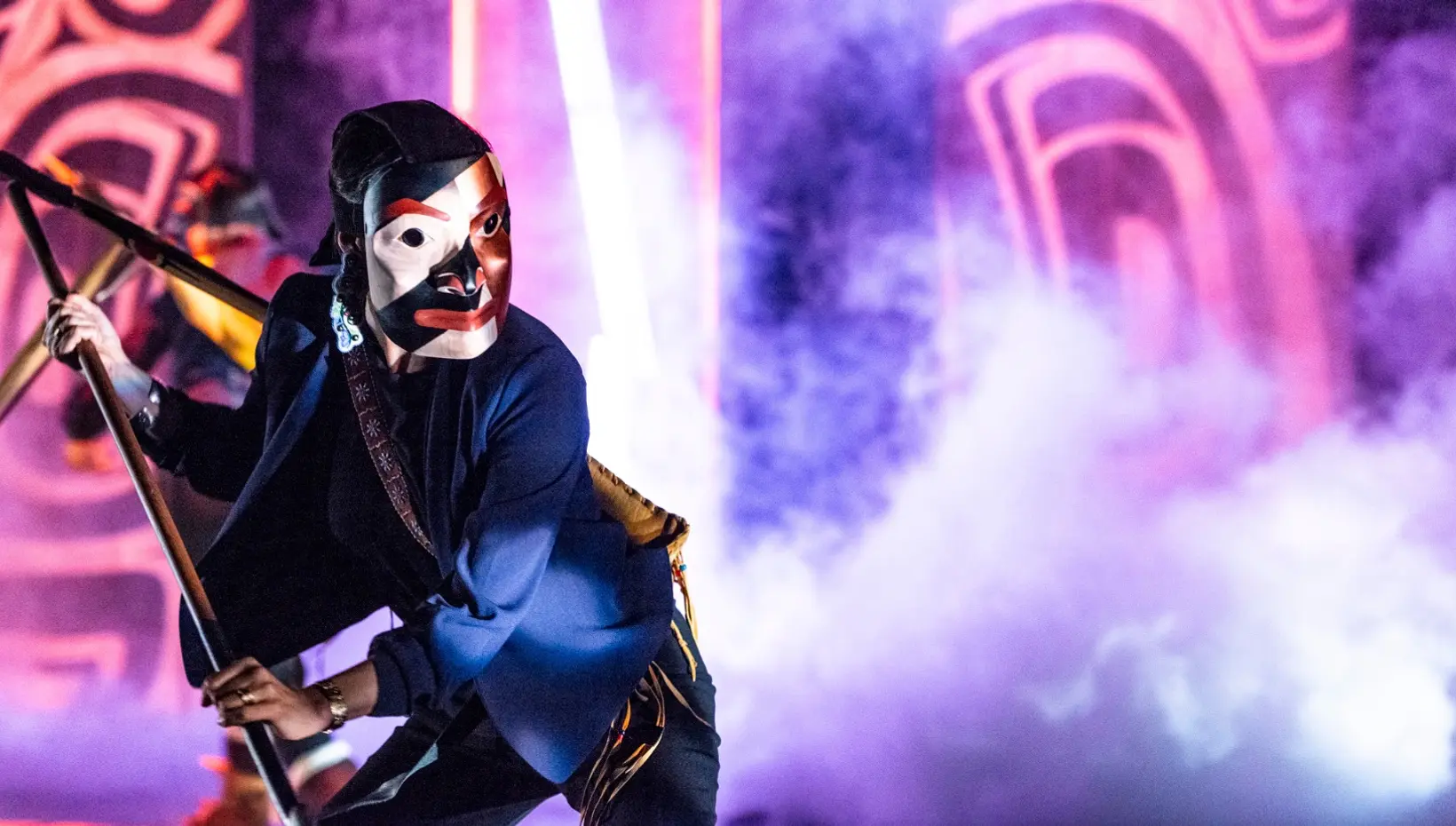 The performer then addresses the audience, first in her language, then in English. She tells the story of Mînowin – how the show is made of the stories and teachings of their people, their elders, and knowledge that was once suppressed by colonisation and potlatch bans. She says the time is coming when this knowledge will be necessary again, that the staff will split the earth, and we will need to remember the lessons from these stories. Transformation will be necessary, the transformation of fear. I take this to mean we will need to move beyond the fear that holds us back from engaging with the world around us (beyond fear of not being the correct kind of Indigenous, perhaps, or whatever keeps us away from our Indigeneity) and to return to our whakapapa and tikanga in order to weather future difficulties. We should not be focusing on the fear – of colonialism, of language loss, of judgement – but instead we should transform this energy and emotion into actions that connect us to our pasts and to one another.