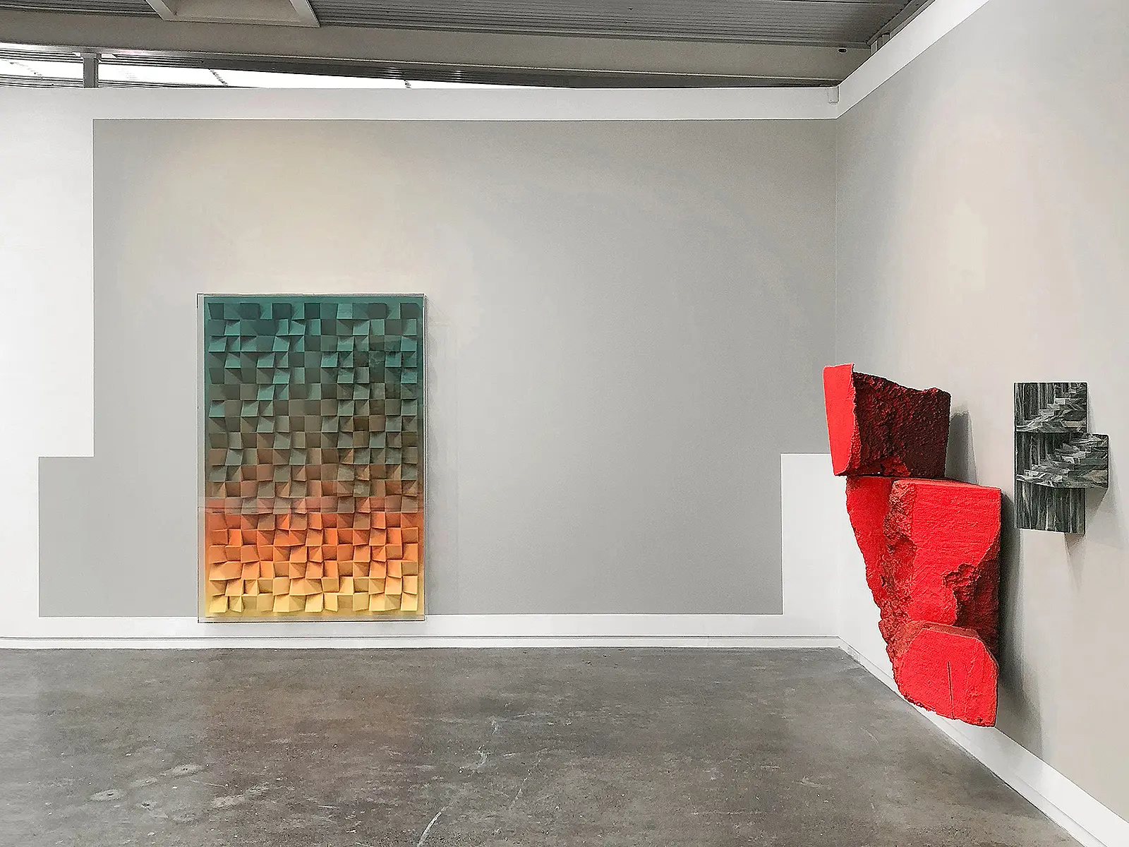 cuttingsOmEEdgEs is the first solo show in Aotearoa by Dusseldorf-based Jan Albers (Germany, 1971). A good number of the works centre on the same form: a cuboid with one edge sliced off that puts me in mind of a compact mono-pitched dwelling. The exhibition is otherwise remarkably diverse, encompassing materials as divergent as burnished aluminium and pigmented polystyrene, and depending equally on traditions of sculpture and painting.