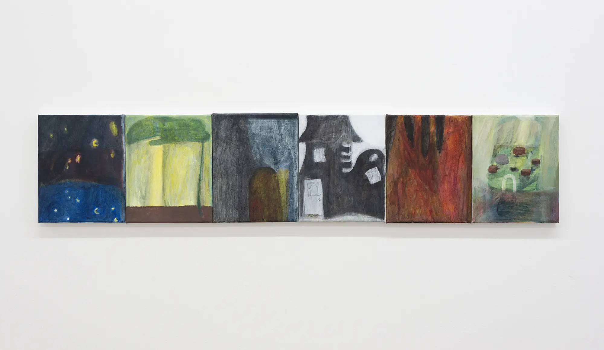 The sculptures are surrounded by a suite of paintings that complicate an easy quest for meaning. A row of six small paintings and a diptych seem to organise a narrative that Ngakuru simultaneously destroys. The form of bunk beds looms large over these works, in the painting Primary, as a figure of sleep or nightmare. The salt lamp becomes a night light amongst the starry portrait, Pisces, the eerie cave in the painting Mill, and the closed Aviary (gate).