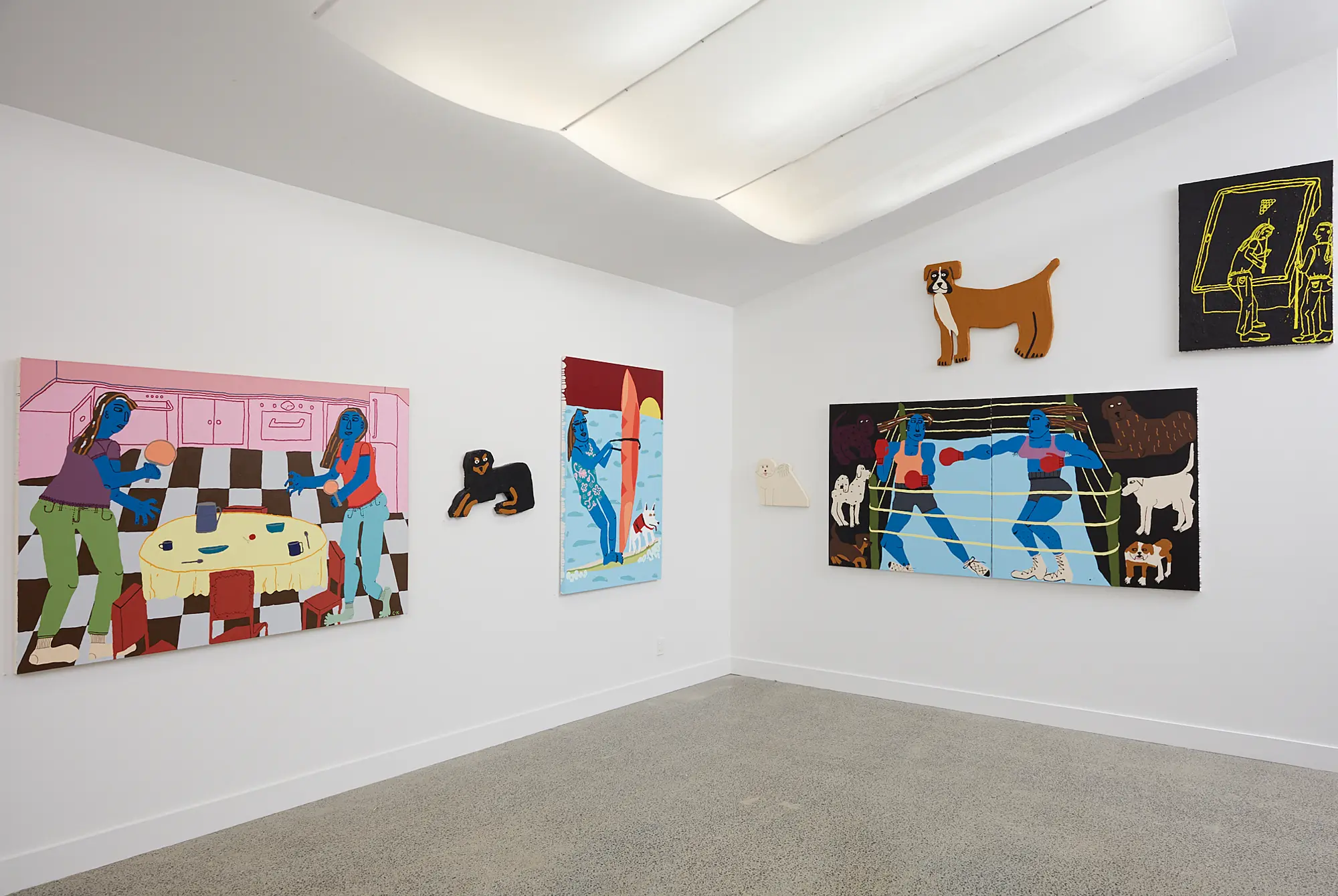 Boxing (2019) captures the moment just before impact between the glove and the body of two boxing women. Around the periphery of the ring are six dogs, looking on. The artist makes her disputes into a form of entertainment for the viewer, which in this case is both you and I, as well as the dogs. Kogachi’s playful work adds to the local regeneration of large-scale painting, a regeneration which is currently dominated by a new wave of women artists. – LL