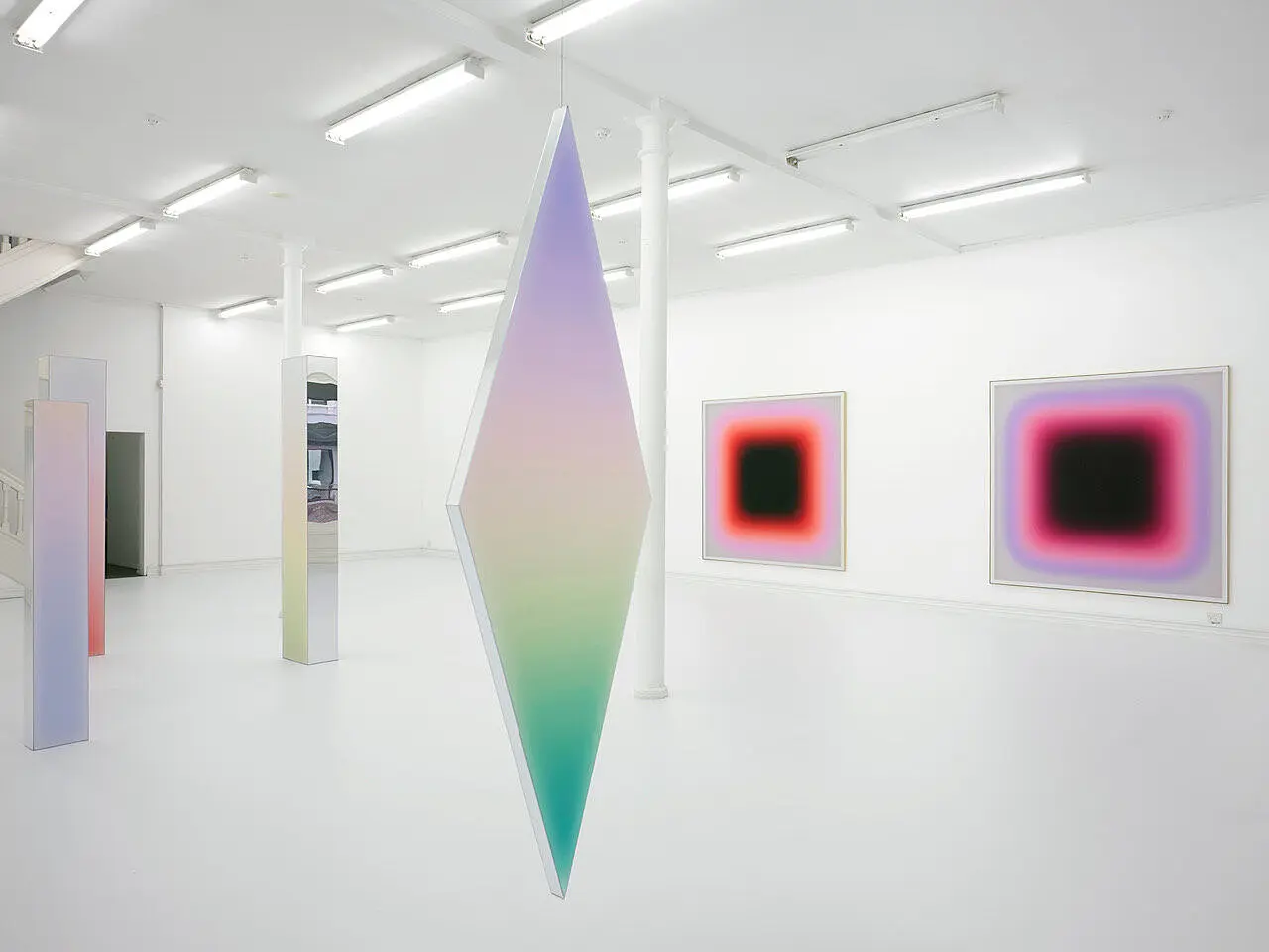 The artwork that fits in most with my imagined life as a fresh-faced NYC writer, is a big diamond-shaped artwork that hangs from the ceiling, slowly rotating, like a fractured disco ball: Glänzen Teilen (Seagrass to Rosemary Blossom). I imagine it hanging in my Brooklyn loft apartment, caressing the air as it spins slowly while Odyssey’s Native New Yorker plays in the background at yet another one of my famed parties. I always liked big, colourful and not necessarily deep artworks (yes, I unashamedly fangirl Jeff Koons), and this plays right into that aesthetic. Upon deeper introspection though, the mirrored surface helps to remind me it’s not all candy-powder-blush and white floors. That the surface isn’t really any less deep than the thing/s beneath it. This thought is echoed in the exhibition text: