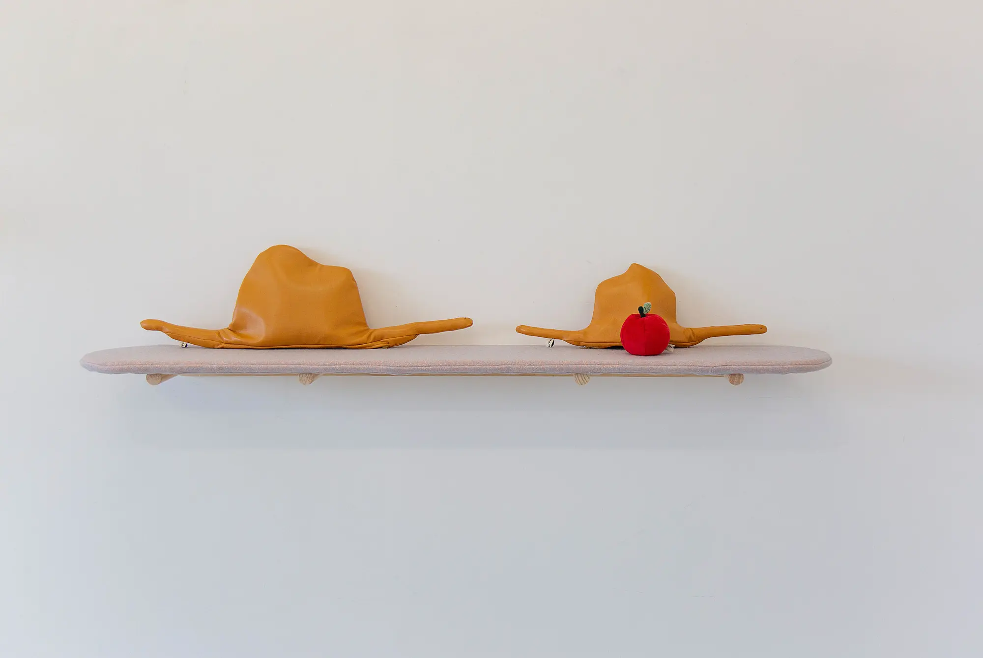 Hanna Shim (born Korea, lives Aotearoa) is known for her fantastical soft sculptures. In Bone Like This, she adds solid elements and explores serious matters – particularly mortality. Classic emblems of death appear, moments of whimsy tempering the morbid. A woollen worm protrudes quizzically from a ceramic skull. A skeleton arm is displayed in a glowing pink Perspex coffin not a little appropriate to the Halloween season. There is a sense that Shim is pondering not only dying but also what constitutes a good life. Thoughts on Aging comprises a plush elephant encased in a zip-up leather snake, alluding to the picture book The Little Prince, and suggesting the freedom of childhood imagination. This work sits alongside Thoughts on Sin, a similar snake enveloping an apple, which evokes the Garden of Eden and so a loss of innocence.