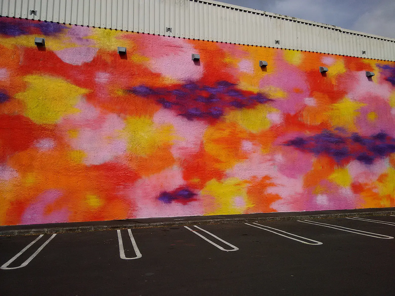 And now – lickety-split with little fuss – our prayers have been answered and its most ugly walls were transformed into an explosive piece of art over summer. At 512sqm, ‘Magma’ by renowned artist Sara Hughes is one of the largest outdoor murals in the country, a bombastic abstract work to brighten up the daily commute of the thousands who pass by on Symonds Street and Mt Eden Road every day (image at top).