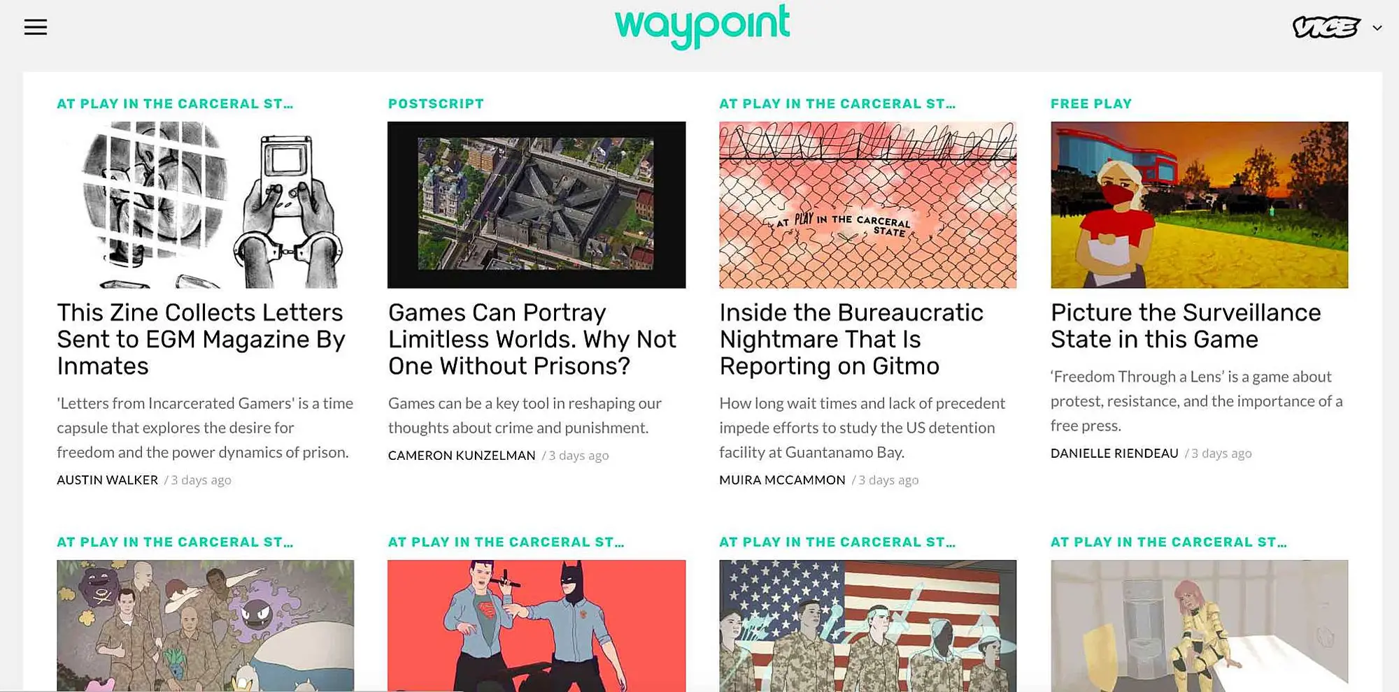 I’m technically breaking the rules already. By the time you read this, Vice’s (US-based) gaming vertical Waypoint will have just finished running a week-long series of features called At Play In The Carceral State. It’s a series of eleven pieces about games and game culture in the context of America’s prison-industrial complex. The centrepiece is a five-part story about video games and board games at Gitmo, but it also includes a follow up to one of my favourite pieces published anywhere last year, a story about a Dungeons and Dragons clan formed in a Colorado maximum security prison. This whole thing pushes my buttons because I’m a fucking nerd, but also because I think it’s really fascinating and incredibly relevant to our own country, a nation built on its own foundation of racist, classist mass incarceration. Our justice system sustains its particular mode of penal populism, like America’s, because it denies the humanity of the people who move through it and we let it do that. Games, and the act of play, reject that denial, and I think Waypoint’s coverage this week is going to ask a lot of questions that’ll be uncomfortably applicable to what’s happening in our own backyard.