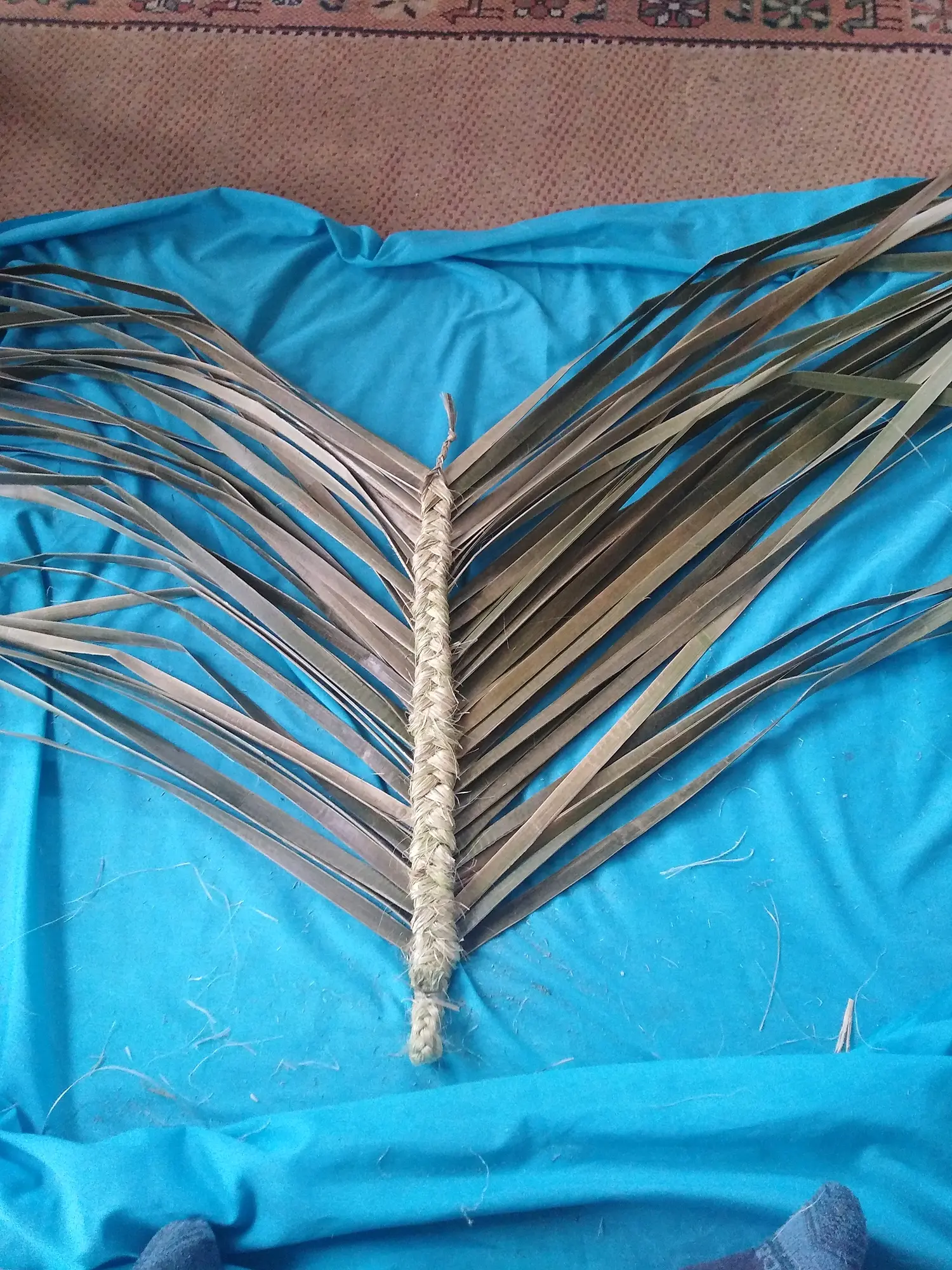 I have a habit of laying out an old pāreu when we weave. That way, it’s easier to catch all of the waste and dispose of it properly. Kitty asks me if this is tikanga. I realise that I don’t know why I do this. Did Veranoa recommend this? But the use of a pāreu? It could be something I have been taught when weaving with my community. It could be both of these things.