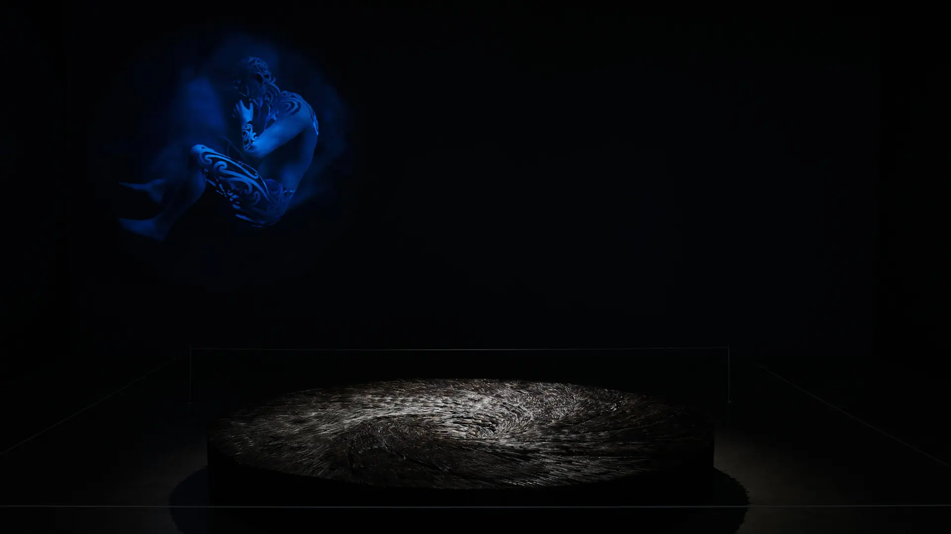 In Taepa’s digital animation Mai Te Uira, Uira (the atua of lightning) takes human form. Curled in a foetal position, floating in mid-air, Te Uira pulses with lightning. The work symbolises innovation and change as being essential elements of the Māori reality. Taepa performs this innovation in the creation of the work itself.